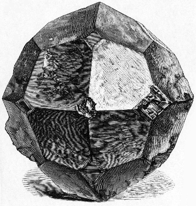 It weighs nine pounds tea ounces (4.4 kilos), and measures fifteen cm. (six inches) in its greatest diameter, and six cm. on its largest trapezohedral face.