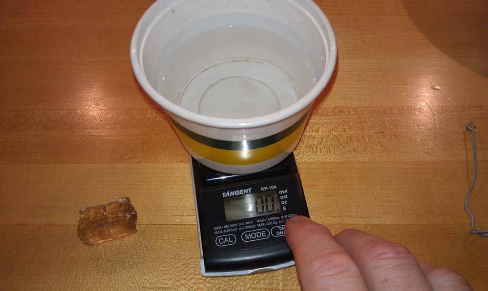 I size the cup of water to the size of the specimen. For small minerals, I use small cups. Because the paperclip displaces water, the small difference does not matter with a large cup of water, so zeroing out does not matter. But with a small cup you should zero the scale by suspending the paperclip in the water (not touching the sides or bottom) for best accuracy.