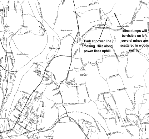 Follow the path to the left (north and uphill) that is under the power lines. The path goes low and swampy at first and then climbs up. Keep going past the first crest, you will go up a second hill. At that crest you will see the mine dump on your left (lots of broken up quartz/feldspar rocks). This is the first pit. Back in the woods 100 yards two large pits and a trench-like prospect on a small rise that has been most productive during recent collecting.